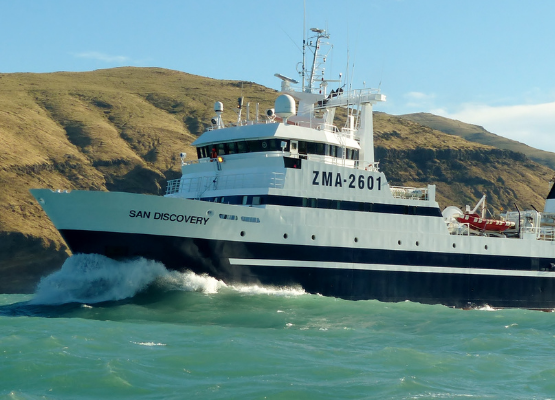 San Enterprise and San Discovery are stern type deep-sea trawlers and have the ability to produce fillets (block and shatter-pack), H&G, squid tubes, fishmeal and fish oil. These products are processed, packaged and labelled to export standards, including the EU and US markets. The vessels target hoki, ling, hake, warehou and arrow squid.