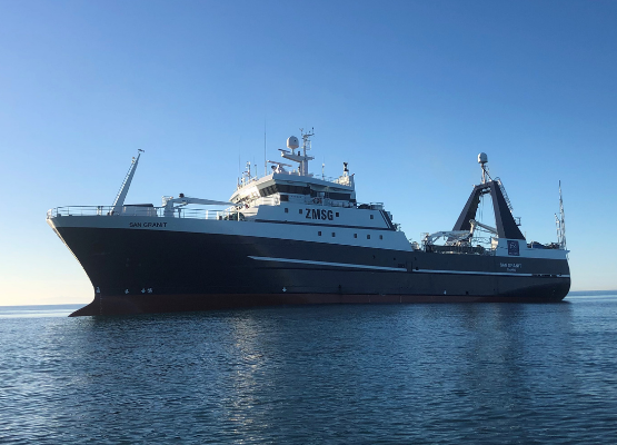 At 67 metres long, the San Granit is the largest vessel of our entire fleet. It is the only twin trawler in our deepwater fleet, which comes with automated horizontal plate freezers and vertical freezers, allowing for large volumes of product to be processed quickly. The San Granit targets mainly hoki and squid.